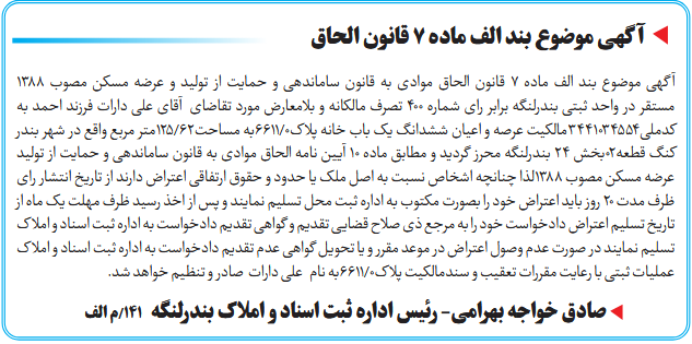 آگهی موضوع بند الف ماده ۷ قانون الحاق موادی به قانون ساماندهی و حمایت از تولید و عرضه مسکن مصوب ۱۳۸۸ مستقر در واحد ثبتی بندرلنگه برابر رای شماره 400 تصرف مالکانه و بلامعارض مورد تقاضای آقای علی دارات فرزند احمد به کدملی3441034554مالکیت عرصه و اعیان ششدانگ یک باب خانه پلاک0/6611به مساحت62/125متر مربع واقع در شهر بندر کنگ قطعه02بخش ۲۴ بندرلنگه محرز گردید و مطابق ماده ۱۰ آیین نامه الحاق موادی به قانون ساماندهی و حمایت از تولید عرضه مسکن مصوب ۱۳۸۸لذا چنانچه اشخاص نسبت به اصل ملک یا حدود و حقوق ارتفاقی اعتراض دارند از تاریخ انتشار رای ظرف مدت ۲۰ روز باید اعتراض خود را بصورت مکتوب به اداره ثبت محل تسلیم نمایند و پس از اخذ رسید ظرف مهلت یک ماه از تاریخ تسلیم اعتراض دادخواست خود را به مرجع ذی صلاح قضایی تقدیم و گواهی تقدیم دادخواست به اداره ثبت اسناد و املاک تسلیم نمایند در صورت عدم وصول اعتراض در موعد مقرر و یا تحویل گواهی عدم تقدیم دادخواست به اداره ثبت اسناد و املاک عملیات ثبتی با رعایت مقررات تعقیب و سندمالکیت پلاک0/6611به نام علی دارات صادر و تنظیم خواهد شد.