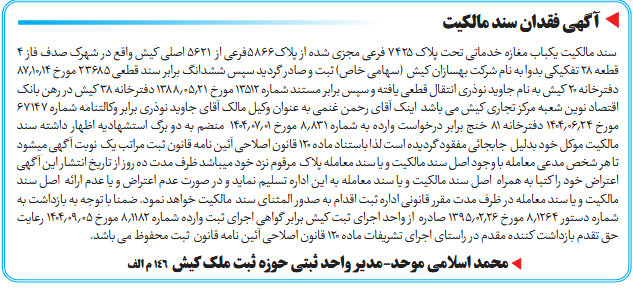 سند مالکیت یکباب مغازه خدماتی تحت پلاک ۷۴۲5 فرعی مجزی شده از پلاک5866فرعی از ۵۶۲۱ اصلی کیش واقع در شهرک صدف فاز ۴ قطعه ۲۸ تفکیکی بدوا به نام شرکت بهسازان کیش (سهامی خاص) ثبت و صادر گردید سپس ششدانگ برابر سند قطعی ۲۳۶۸5 مورخ ۸۷٫۱۰٫۱۴ دفترخانه ۲۰ کیش به نام جاوید نوذری انتقال قطعی یافته و سپس برابر مستند شماره ۱۳۵۱۲ مورخ ۱۳۸۸٫۰۵٫۲۱ دفترخانه ۳۸ کیش در رهن بانک اقتصاد نوین شعبه مرکز تجاری کیش می باشد اینک آقای رحمن غنمی به عنوان وکیل مالک آقای جاوید نوذری برابر وکالتنامه شماره ۶۷۱۴۷ مورخ ۱۴۰۴٫۰۶٫۲۴ دفترخانه ۸۱ خنج برابر درخواست وارده به شماره ۸٫۸۳۱ مورخ ۱۴۰۴٫۰۷٫۰۱ منضم به دو برگ استشهادیه اظهار داشته سند مالکیت موکل خود بدلیل جابجائی مفقود گردیده است لذا باستناد ماده ۱۲۰ قانون اصلاحی آئین نامه قانون ثبت مراتب یک نوبت آگهی میشود تا هر شخص مدعی معامله با وجود اصل سند مالکیت و یا سند معامله پلاک مرقوم نزد خود میباشد ظرف مدت ده روز از تاریخ انتشار این آگهی اعتراض خود را کتبا به همراه اصل سند مالکیت و یا سند معامله به این اداره تسلیم نماید و در صورت عدم اعتراض و یا عدم ارائه اصل سند مالکیت و یا سند معامله در ظرف مدت مقرر قانونی اداره ثبت اقدام به صدور المثنای سند مالکیت خواهد نمود. ضمنا با توجه به بازداشت به شماره دستور ۸٫۱۲۶۴ مورخ ۱۳۹۵٫۰۲٫۲۶ صادره از واحد اجرای ثبت کیش برابر گواهی اجرای ثبت وارده شماره ۸٫۱۱۸۲ مورخ ۱۴۰۴٫۰۹٫۰۵ رعایت حق تقدم بازداشت کننده مقدم در راستای اجرای تشریفات ماده ۱۲۰ قانون اصلاحی آئین نامه قانون ثبت محفوظ می باشد.