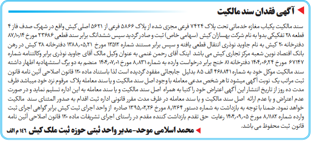 سند مالکیت یکباب مغازه خدماتی تحت پلاک ۷۴۲۴ فرعی مجزی شده از پلاک ۵۸۶۶ فرعی از ۵۶۲۱ اصلی کیش واقع در شهرک صدف فاز ۴ قطعه ۲۸ تفکیکی بدوا به نام شرکت بهسازان کیش (سهامی خاص) ثبت و صادر گردید سپس ششدانگ برابر سند قطعی ۲۳۶۸۶ مورخ ۸۷٫۱۰٫۱۴ دفترخانه ۲۰ کیش به نام جاوید نوذری انتقال قطعی یافته و سپس برابر مستند شماره ۱۳۵۱۲ مورخ ۱۳۸۸٫۰۵٫۲۱ دفترخانه ۳۸ کیش در رهن بانک اقتصاد نوین شعبه مرکز تجاری کیش می باشد اینک آقای رحمن غنمی به عنوان وکیل مالک آقای جاوید نوذری برابر وکالتنامه شماره ۶۷۱۴۷ مورخ ۱۴۰۴٫۰۶٫۲۴ دفترخانه ۸۱ خنج برابر درخواست وارده به شماره ۸٫۸۳۱ مورخ ۱۴۰۴٫۰۷٫۰۱ منضم به دو برگ استشهادیه اظهار داشته سند مالکیت موکل خود به شماره ۴۶۸۸۴۱ الف ۸۵ بدلیل جابجائی مفقود گردیده است لذا باستناد ماده ۱۲۰ قانون اصلاحی آئین نامه قانون ثبت مراتب یک نوبت آگهی میشود تا هر شخص مدعی معامله با وجود اصل سند مالکیت و یا سند معامله پلاک مرقوم نزد خود میباشد ظرف مدت ده روز از تاریخ انتشار این آگهی اعتراض خود را کتبا به همراه اصل سند مالکیت و یا سند معامله به این اداره تسلیم نماید و در صورت عدم اعتراض و یا عدم ارائه اصل سند مالکیت و یا سند معامله در ظرف مدت مقرر قانونی اداره ثبت اقدام به صدور المثنای سند مالکیت خواهد نمود. ضمنا با توجه به بازداشت به شماره دستور ۸٫۱۲۶۴ مورخ ۱۳۹۵٫۰۲٫۲۶ صادره از واحد اجرای ثبت کیش برابر گواهی اجرای ثبت وارده شماره ۸٫۱۱۸۲ مورخ ۱۴۰۴٫۰۹٫۰۵ رعایت حق تقدم بازداشت کننده مقدم در راستای اجرای تشریفات ماده ۱۲۰ قانون اصلاحی آئین نامه قانون ثبت محفوظ می باشد.