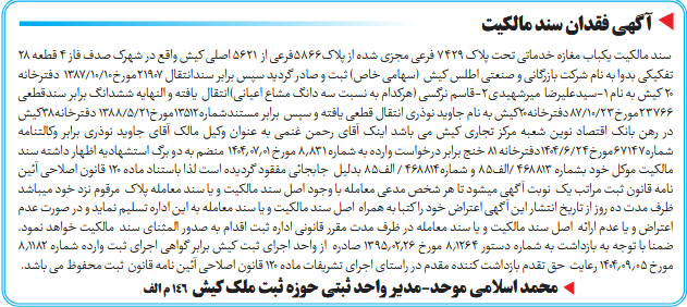 سند مالکیت یکباب مغازه خدماتی تحت پلاک ۷۴۲9 فرعی مجزی شده از پلاک5866فرعی از ۵۶۲۱ اصلی کیش واقع در شهرک صدف فاز ۴ قطعه ۲۸ تفکیکی بدوا به نام شرکت بازرگانی و صنعتی اطلس کیش (سهامی خاص) ثبت و صادر گردید سپس برابر سندانتقال 21907مورخ10/10/1387 دفترخانه ۲۰ کیش به نام 1-سیدعلیرضا میرشهیدی2-قاسم نرگسی (هرکدام به نسبت سه دانگ مشاع اعیانی)انتقال یافته و النهایه ششدانگ برابر سندقطعی23766مورخ23/10/87دفترخانه20کیش به نام جاوید نوذری انتقال قطعی یافته و سپس برابر مستندشماره13512مورخ21/5/1388 دفترخانه38کیش در رهن بانک اقتصاد نوین شعبه مرکز تجاری کیش می باشد اینک آقای رحمن غنمی به عنوان وکیل مالک آقای جاوید نوذری برابر وکالتنامه شماره67147مورخ24/6/1404دفترخانه ۸۱ خنج برابر درخواست وارده به شماره ۸٫۸۳۱ مورخ ۱۴۰۴٫۰۷٫۰۱ منضم به دو برگ استشهادیه اظهار داشته سند مالکیت موکل خود بشماره 468813 /الف85 و شماره468814 / الف85 بدلیل جابجائی مفقود گردیده است لذا باستناد ماده ۱۲۰ قانون اصلاحی آئین نامه قانون ثبت مراتب یک نوبت آگهی میشود تا هر شخص مدعی معامله با وجود اصل سند مالکیت و یا سند معامله پلاک مرقوم نزد خود میباشد ظرف مدت ده روز از تاریخ انتشار این آگهی اعتراض خود را کتبا به همراه اصل سند مالکیت و یا سند معامله به این اداره تسلیم نماید و در صورت عدم اعتراض و یا عدم ارائه اصل سند مالکیت و یا سند معامله در ظرف مدت مقرر قانونی اداره ثبت اقدام به صدور المثنای سند مالکیت خواهد نمود. ضمنا با توجه به بازداشت به شماره دستور ۸٫۱۲۶۴ مورخ ۱۳۹۵٫۰۲٫۲۶ صادره از واحد اجرای ثبت کیش برابر گواهی اجرای ثبت وارده شماره ۸٫۱۱۸۲ مورخ ۱۴۰۴٫۰۹٫۰۵ رعایت حق تقدم بازداشت کننده مقدم در راستای اجرای تشریفات ماده ۱۲۰ قانون اصلاحی آئین نامه قانون ثبت محفوظ می باشد.