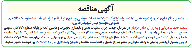 (تعمیر و نگهداری تجهیزات و ماشین الات غیراستراتژیک شرکت خدمات دریایی و بندری آریا بنادر ایرانیان پایانه شماره یک کالاهای عمومی مجتمع بندر شهید رجایی)آگهی مناقصه