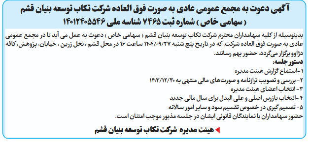 بدینوسیله از کلیه سهامداران محترم شرکت تکاب توسعه بنیان قشم ( سهامی خاص ) دعوت به عمل می آید تا در مجمع عمومی عادی به صورت فوق العاده شرکت، که در تاریخ پنج شنبه 27/۰۹/1404 ساعت ۱۶ در محل قشم ، نخل زرین ، خیابان، پژوهش، کافه دژاوو برگزار میگردد، حضور بهم رسانند.