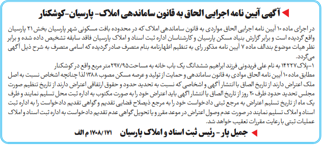 در اجرای ماده ۱۰ آیین نامه اجرایی الحاق مواردی به قانون ساماندهی املاک که در محدوده بافت مسکونی شهر پارسیان بخش ۲۱ پارسیان واقع گردیده است و برابر گزارش بنیاد مسکن پارسیان و کارشناسان اداره ثبت اسناد و املاک پارسیان فاقد سابقه تشخیص داده شده و برابر نظر هیات موضوع بندالف ماده ۷ آیین نامه مذکور رای به تنظیم اظهارنامه بنام متصرف صادر گردیده که اسامی متصرف به شرح ذیل آگهی میگردد.