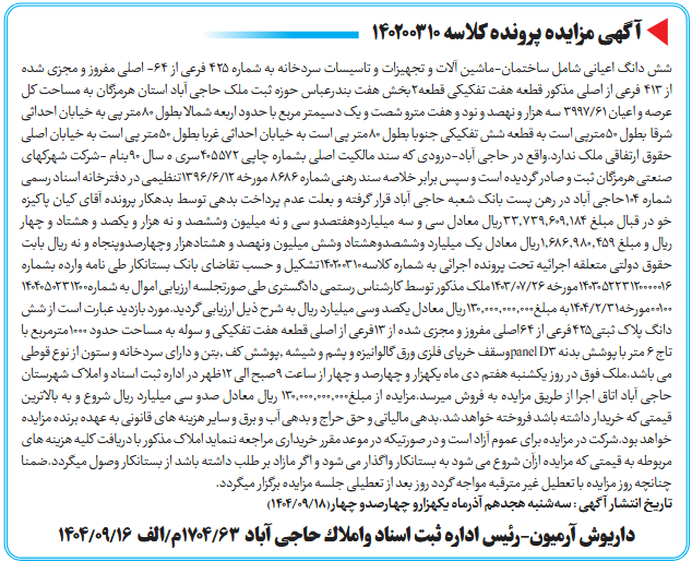 شش دانگ اعیانی شامل ساختمان-ماشین آلات و تجهیزات و تاسیسات سردخانه به شماره 425 فرعی از 64- اصلی مفروز و مجزی شده از 413 فرعی از اصلی مذکور قطعه هفت تفکیکی قطعه2بخش هفت بندرعباس حوزه ثبت ملک حاجی آباد استان هرمزگان به مساحت کل عرصه و اعیان 61/3997 سه هزار و نهصد و نود و هفت مترو شصت و یک دسیمتر مربع با حدود اربعه شمالا بطول 80متر پی به خیابان احداثی شرقا بطول 50مترپی است به قطعه شش تفکیکی جنوبا بطول 80متر پی است به خیابان احداثی غربا بطول 50متر پی است به خیابان اصلی حقوق ارتفاقی ملک ندارد.واقع در حاجی آباد-درودی که سند مالکیت اصلی بشماره چاپی 405572سری ه سال 90بنام -شرکت شهرکهای صنعتی هرمزگان ثبت و صادر گردیده است و سپس برابر خلاصه سند رهنی شماره 8686 مورخه 12/6/1396تنظیمی در دفترخانه اسناد رسمی شماره 104حاجی آباد در رهن پست بانک شعبه حاجی آباد قرار گرفته و بعلت عدم پرداخت بدهی توسط بدهکار پرونده آقای کیان پاکیزه خو در قبال مبلغ 33,739,609,184ریال معادل سی و سه میلیاردوهفتصدو سی و نه میلیون وششصد و نه هزار و یکصد و هشتاد و چهار ریال و مبلغ 1,686,980,459ریال معادل یک میلیارد وششصدوهشتاد وشش میلیون ونهصد و هشتادهزار وچهارصدوپنجاه و نه ریال بابت حقوق دولتی متعلقه اجرائیه تحت پرونده اجرائی به شماره کلاسه140200310تشکیل و حسب تقاضای بانک بستانکار طی نامه وارده بشماره 140305223120000016مورخه 26/07/1403ملک مذکور توسط کارشناس رستمی دادگستری طی صورتجلسه ارزیابی اموال به شماره140405023120000100مورخه31/2/1404به مبلغ130,000,000,000ریال معادل یکصد وسی میلیارد ریال به شرح ذیل ارزیابی گردید.مورد بازدید عبارت است از شش دانگ پلاک ثبتی425فرعی از 64اصلی مفروز و مجزی شده از 13فرعی از اصلی قطعه هفت تفکیکی و سوله به مساحت حدود 1000مترمربع با تاج 6 متر با پوشش بدنه D3 panelوسقف خرپای فلزی ورق گالوانیزه و پشم و شیشه ,پوشش کف ,بتن و دارای سردخانه و ستون از نوع قوطی می باشد.ملک فوق در روز یکشنبه هفتم دی ماه یکهزار و چهارصد و چهار از ساعت 9صبح الی 12ظهر در اداره ثبت اسناد و املاک شهرستان حاجی آباد اتاق اجرا از طریق مزایده به فروش میرسد.مزایده از مبلغ130,000,000,000 ریال معادل صدو سی میلیارد ریال شروع و به بالاترین قیمتی که خریدار داشته باشد فروخته خواهد شد.بدهی مالیاتی و حق حراج و بدهی آب و برق و سایر هزینه های قانونی به عهده برنده مزایده خواهد بود.شرکت در مزایده برای عموم آزاد است و در صورتیکه در موعد مقرر خریداری مراجعه ننماید املاک مذکور با دریافت کلیه هزینه های مربوطه به قیمتی که مزایده ازآن شروع می شود به بستانکار واگذار می شود و اگر مازاد بر طلب داشته باشد از بستانکار وصول میگردد.ضمنا چنانچه روز مزایده با تعطیل غیر مترقبه مواجه گردد روز بعد از تعطیلی جلسه مزایده برگزار میگردد.