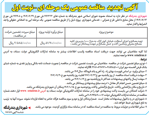 شهرداری بندرلنگه در نظر دارد به استناد مصوبه شورای اسلامی شهر بندرلنگه به شماره های 126323/ش مورخ 29/02/1404 و 126408/ش مورخ 13/07/1404 از محل منابع داخلی طرح عمرانی - خدماتی شهرداری پروژه ذیل را از طریق مناقصه عمومی یک مرحله ایی به اشخاص حقوقی واجد الشرایط واگذار نماید .