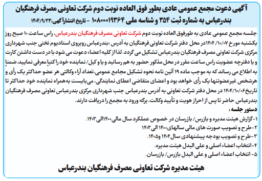 جلسه مجمع عمومی عادی به طورفوق العاده نوبت دوم شرکت تعاونی مصرف فرهنگیان بندرعباس، راس ساعت 10 صبح روز یکشنبه مورخ 07/10/ 1404در محل دفتر شرکت تعاونی فرهنگیان به آدرس :بندرعباس روبروی استادیوم تختی جنب شهرداری مرکزی شرکت تعاونی مصرف فرهنگیان بندرعباس تشکیل می گردد. لذا از کلیه اعضاء دعوت می شود با در دست داشتن کارت و یا دفترچه عضویت راس ساعت مقرر در محل مذکور حضور به هم رسانید و یا و کیل/ نماینده خود را کتباً معرفی نمایید.ضمناً به اطلاع می رساند که به موجب ماده 19 آئین نامه نحوه تشکیل مجامع عمومی،تعداد آراء وکالتی هر عضو حداکثر یک رأی و هرشخص غیرعضوتنها یک رأی خواهد بود و اعضای متقاضی اعطای نمایندگی، میبایست بههمراه نماینده خود حداكثر تا تاریخ06/10/1404 در محل دفتر شرکت تعاونی به آدرس بندرعباس جنب شهرداری مرکزی بندرعباس تعاونی مصرف فرهنگیان بندرعباس حاضر تا پس از احراز هویت و تأیید وكالت، برگه ورود به مجمع را دریافت دارند.