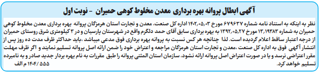 نظر به اینکه به استناد نامه شماره ۶۷۹۶۳۷ مورخ ۱۴۰۲٫۰۵٫۰۳ اداره کل صنعت، معدن و تجارت استان هرمزگان پروانه بهره برداری معدن مخلوط کوهی حمیران به شماره ۱۳٫۱۹۳۸۳ مورخ ۱۳۹۲٫۰۵٫۲۷ به بهره برداری سابق آقای حمد دلگرم واقع در شهرستان پارسیان و در ۳ کیلومتری شرق روستای حمیران از درجه اعتبار ساقط اعلام گردیده است. لذا چنانچه هر کس نسبت به پروانه بهره برداری فوق مدعی میباشد ،باید حداکثر ظرف مدت ده روز پس از انتشار آگهی فوق به اداره کل صنعت ،معدن و تجارت استان هرمزگان مراجعه و اعتراض خود را ضمن ارائه اصل پروانه تسلیم نمایند و اگر ظرف مهلت مقرر اعتراضی نرسد و یا در صورت اعتراض اصل پروانه ارائه نشود، سازمان استان المثنی پروانه را طبق مقررات به نام بهره بردار جدید صادر و به نامبرده تسلیم خواهد کرد. 555 /1404 م الف