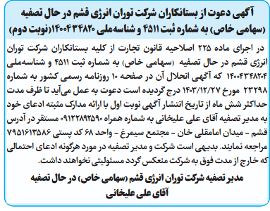 در اجرای ماده 225 اصلاحیه قانون تجارت از کلیه بستانکاران شرکت توران انرژی قشم در حال تصفیه (سهامـی خاص) به شمـاره ثبت 4511 و شناسهملـی 14004348204 که آگهـی انحلال آن در صفحـه 10 روزنامـه رسمـی کشور به شماره 23298 مورخ 27/12/1403 درج گردیده است دعوت به عمل میآید تا ظرف مدت حداکثر شش ماه از تاریخ انتشار آگهی نوبت اول با ارائه مدارک مثبته ادعای خود به مدیر تصفیه آقای علی علیخانی به شماره همراه 09122892590 مستقر در آدرس قشم - میدان امامقلی خان - مجتمع سیمرغ - واحد 68 کد پستی 7951613586 مراجعه نمایند. بدیهی است شرکت و مدیر تصفیه در مورد هرگونه ادعای احتمالی که خارج از مدت فوق به شرکت منعکس گردد مسئولیتی نخواهند داشت.