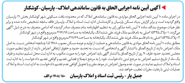 در اجرای ماده ۱۰ آیین نامه اجرایی الحاق مواردی به قانون ساماندهی املاک که در محدوده بافت مسکونی شهر کوشکنار بخش ۲۱ پارسیان واقع گردیده است و برابر گزارش بنیاد مسکن پارسیان و کارشناسان اداره ثبت اسناد و املاک پارسیان فاقد سابقه تشخیص داده شده و برابر نظر هیات موضوع بندالف ماده ۷ آیین نامه مذکور رای به تنظیم اظهارنامه بنام متصرف صادر گردیده که اسامی متصرف به شرح ذیل آگهی میگردد. 1-پلاک15345 اصلی به نام قاسم ملک فرزند علی ششدانگ یکبابخانه به مساحت16/476 مترمربع واقع در شهر کوشکنار