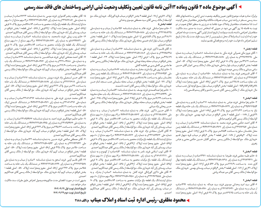 برابرآراء صادره هیات موضوع قانون تعیین وتکلیف وضعیت ثبتی اراضی و ساختمانهای فاقد سند رسمی مستقر در واحد ثبتی میناب تصرفات مالکانه وبلامعارض متقاضیان محرز گردیده است لذا مشخصات متقاضیان واملاک مورد تقاضا به شرح زیر به منظور اطلاع عموم در دو نوبت به فاصله 15 روز آگهی می شود در صورتی که اشخاص نسبت به صدور سند مالکیت متقاضیان اعتراضی داشته باشند میتوانند از تاریخ انتشار اولین آگهی به مدت دو ماه اعتراض خود را به اداره ثبت اسناد واملاک محل تسلیم و پس از اخذ رسید ظرف مدت یک ماه از تاریخ