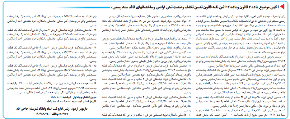 برابر آراء هیات موضوع قانون تعیین تكلیف وضعیت ثبتی اراضی وساختمانهای فاقد سند رسمی مستقر در واحد ثبتی حاجی آباد تصرفات مالكانه وبلامعارض متقاضیان محرز گردیده است لذا مشخصات متقاضیان وپلاك مورد تقاضا به شرح زیرجهت اطلاع عموم در دو نوبت به فاصله 15 روز آْگهی می شود در صورتی كه هركس نسبت به صدور سند مالكیت بنام متقاضیان اعتراض داشته باشد می تواند از تاریخ انتشار اولین آگهی به مدت دو ماه اعتراض خود را كتباً به اداره ثبت اسناد واملاك محل تسلیم وپس از اخذ رسید ظرف مدت یكماه از تاریخ تسلیم اعتراض دادخواست خود را به مراجع محترم قضایی تقدیم وگواهی تقدیم دادخواست را به اداره ثبت محل تحویل نماید، در هر حال صدور سند مالكیت جدید مانع مراجعه متضرر به دادگاه نخواهد شد %
