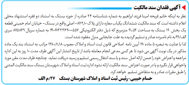 لذا با عنایت به تبصره ۵ ماده ۱۲۰ آیین نامه اصلاحی قانون ثبت اسناد و املاک مصوب ۱۳۸۰٫۱۱٫۱۸ مراتب به استناد بند یک ماده مذکور در یک نوبت آگهی می شود تا هر کسی مدعی انجام معامله باشد از تاریخ انتشار این آگهی ظرف مدت ۱۰ روز به این اداره مراجعه و اعتراض خود را ضمن ارائه اصل سند و یا سند انتقال رسمی تسلیم و رسید دریافت نماید. چنانچه ظرف مدت مقرر مورد واخواهی قرار نگیرد و یا در صورت اعتراض سند مالکیت ارائه نشود اداره ثبت اسناد و املاک شهرستان بستک سند مالکیت المثنی را طبق مقررات صادر و به متقاضی تسلیم خواهد کرد.