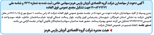 بدین وسیله از کلیه سهامداران شرکت دعوت می شود تا در جلسه مجمع عمومی فوق العاده شرکت که راس ساعت 10 صبح مورخ 15/10/1404در محل قانونی شرکت به نشانی استان هرمزگان، شهرستان بندرعباس،کوی ولایت، بلوار رسالت شمالی،کوچه خیام،ساختمان خاطره، طبقه سوم،واحد 5 کدپستی7919777116 تشکیل می گردد حضور بهمراه رسانند .حضور همه صاحبان سهام یا نمایندگان قانونی آنها در جلسه الزامی می باشد.