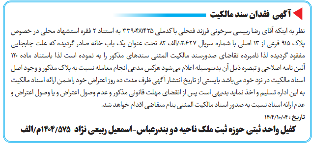 نظر به اینکه آقای رضا رییسی سرخونی فرزند فتحلی با کدملی ۳۳۹۰۴۸۱۴۳۵ به استناد ۲ فقره استشهاد محلی در خصوص پلاک ۹۱۵ فرعی از ۱۳ اصلی با شماره سریال ۰۲۰۶۲۷/الف ۸۲ تحت عنوان یک باب خانه صادر گردیده که علت جابجایی مفقود گردیده لذا نامبرده تقاضای صدورسند مالکیت المثنی سندهای مذکور را به نموده است لذا باستناد ماده ۱۲۰ آئین نامه اصلاحی و تبصره ذیل آن بدینوسیله اعلام میشود هرکس مدعی انجام معامله نسبت به پلاک مذکور و وجود اصل اسناد مالکیت در نزد خود میباشد بایستی از تاریخ انتشار آگهی ظرف مدت ده روز اعتراض خود راضمن ارائه اسناد مالکیت به این اداره تسلیم و اخذ نماید بدیهی است پس از انقضای مهلت قانونی مذکور و عدم وصول اعتراض و یا وصول اعتراض و عدم ارائه اسناد نسبت به صدور اسناد مالکیت المثنى بنام متقاضی اقدام خواهد شد.