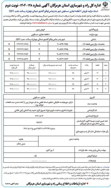 اسناد مزایده فروش 4 قطعه تجاری-مسکونی شهر بندرعباس(واقع گلشهر شمالی،چهارراه رسالت-جنب QFC) نوبت دوم
