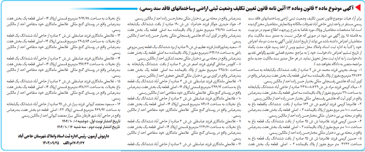 برابر آراء هیات موضوع قانون تعیین تكلیف وضعیت ثبتی اراضی وساختمانهای فاقد سند رسمی مستقر در واحد ثبتی حاجی آباد تصرفات مالكانه وبلامعارض متقاضیان محرز گردیده است لذا مشخصات متقاضیان وپلاك مورد تقاضا به شرح زیرجهت اطلاع عموم در دو نوبت به فاصله 15 روز آْگهی می شود در صورتی كه هركس نسبت به صدور سند مالكیت بنام متقاضیان اعتراض داشته باشد می تواند از تاریخ انتشار اولین آگهی به مدت دو ماه اعتراض خود را كتباً به اداره ثبت اسناد واملاك محل تسلیم وپس از اخذ رسید ظرف مدت یكماه از تاریخ تسلیم اعتراض دادخواست خود را به مراجع محترم قضایی تقدیم وگواهی تقدیم دادخواست را به اداره ثبت محل تحویل نماید، در هر حال صدور سند مالكیت جدید مانع مراجعه متضرر به دادگاه نخواهد شد %