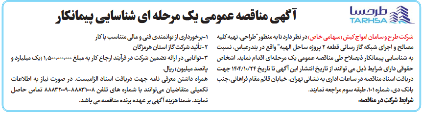شرکت طرح و سامان امواج کیش (سهامی خاص) در نظر دارد تا به منظور"طراحی، تهیه کلیه مصالح و اجرای شبکه گاز رسانی قطعه 2 پروژه ساحل الهیه" واقع در بندرعباس، نسبت به شناسایی پیمانکار ذیصلاح طی مناقصه عمومی یک مرحلهای اقدام نماید. اشخاص حقوقی دارای شرایط ذیل می توانند از تاریخ انتشار این آگهی تا تاریخ 24/10/1404 جهت دریافت اسناد مناقصه در ساعات اداری به نشانی تهران، خیابان قائم مقام فراهانی،جنب بانک دی، شماره 101، طبقه سوم مراجعه نمایند.