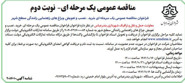 مناقصه عمومی یک مرحله ای- نوبت دومفراخوان مناقصه عمومی یک مرحله ای خرید ، نصب و تعویض چراغ های راهنمایی رانندگی سطح شهر