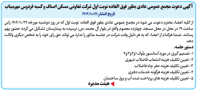 از کلیه اعضاء محترم دعوت می شود در مجمع عمومی عادی بطور فوق العاده نوبت اول که در روز دوشنبه مورخه 29/10/1404 راس ساعت 19 در محل در محل مسجد چهارده معصوم واقع در بلوار آل محمد (ص) نرسیده به بیمارستان تشکیل می گردد حضور بهم رسانند. ضمنا هرکدام از اعضاء که به هر دلیل وقت شرکت در جلسه مذکور را ندارد می تواند حق رای خود را به شخص دیگری وکالت دهد.