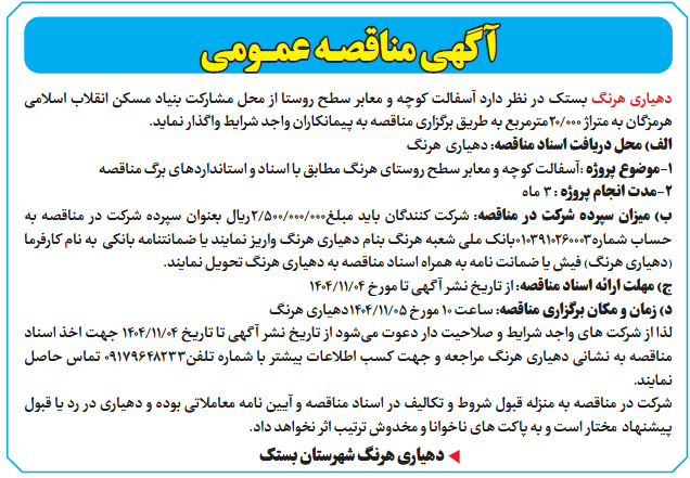 دهیاری هرنگ بستک در نظر دارد آسفالت کوچه و معابر سطح روستا از محل مشارکت بنیاد مسکن انقلاب اسلامی هرمزگان به متراژ 000/20مترمربع به طریق برگزاری مناقصه به پیمانکاران واجد شرایط واگذار نماید.