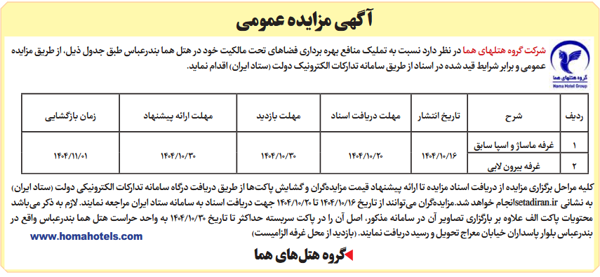 شرکت گروه هتلهای هما در نظر دارد نسبت به تملیک منافع بهره برداری فضاهای تحت مالکیت خود در هتل هما بندرعباس طبق جدول ذیل، از طریق مزایده عمومی و برابر شرایط قید شده در اسناد از طریق سامانه تدارکات الکترونیک دولت (ستاد ایران) اقدام نماید.