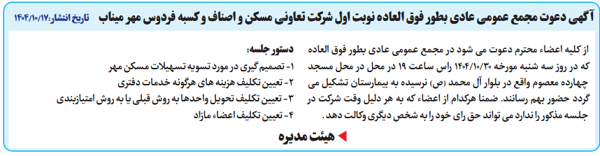 از کلیه اعضاء محترم دعوت می شود در مجمع عمومی عادی بطور فوق العاده که در روز سه شنبه مورخه 30/10/1404 راس ساعت 19 در محل در محل مسجد چهارده معصوم واقع در بلوار آل محمد (ص) نرسیده به بیمارستان تشکیل می گردد حضور بهم رسانند. ضمنا هرکدام از اعضاء که به هر دلیل وقت شرکت در جلسه مذکور را ندارد می تواند حق رای خود را به شخص دیگری وکالت دهد .