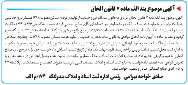 آگهی موضوع بند الف ماده ۷ قانون الحاق موادی به قانون ساماندهی و حمایت از تولید و عرضه مسکن مصوب ۱۳۸۸ مستقر در واحد ثبتی بندرلنگه برابر رای شماره 508 تصرف مالکانه و بلامعارض مورد تقاضای آقای صالح اسمانی فرزند حسین به کدملی344107976مالکیت عرصه و اعیان ششدانگ یک باب خانه پلاک6775به مساحت60/18متر مربع واقع در شهر بندرکنگ قطعه02 بخش ۲۴ بندرلنگه محرز گردید و مطابق ماده ۱۰ آیین نامه الحاق موادی به قانون ساماندهی و حمایت از تولید عرضه مسکن مصوب ۱۳۸۸لذا چنانچه اشخاص نسبت به اصل ملک یا حدود و حقوق ارتفاقی اعتراض دارند از تاریخ انتشار رای ظرف مدت ۲۰ روز باید اعتراض خود را بصورت مکتوب به اداره ثبت محل تسلیم نمایند و پس از اخذ رسید ظرف مهلت یک ماه از تاریخ تسلیم اعتراض دادخواست خود را به مرجع ذی صلاح قضایی تقدیم و گواهی تقدیم دادخواست به اداره ثبت اسناد و املاک تسلیم نمایند در صورت عدم وصول اعتراض در موعد مقرر و یا تحویل گواهی عدم تقدیم دادخواست به اداره ثبت اسناد و املاک عملیات ثبتی با رعایت مقررات تعقیب و سندمالکیت پلاک6775 به نام آقای صالح اسمانی صادر و تنظیم خواهد شد.
