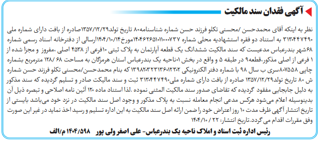 نظر به اینکه آقای محمدحسن /محسنی تکلو فرزند حسن شماره شناسنامه80 تاریخ تولد29/12/1357صادره از بافت دارای شماره ملی 3130447490 به استناد دو فقره استشهادیه محلی شماره 140462651011000737مورخ14/10/1404ارسالی از دفترخانه اسناد رسمی شماره 68شهر بندرعباس مدعیست که سند مالکیت ششدانگ یک قطعه آپارتمان به پلاک ثبتی 10فرعی از 4538 اصلی ،مفروز و مجزا شده از 1 فرعی از اصلی مذکور،قطعه9 در طبقه 5 و واقع در بخش 01ناحیه یک بندرعباس استان هرمزگان به مساحت 68 /128 مترمربع بشماره چاپی 807558سری ب سال 98 با شماره دفتر الکترونیکی 139820323136012302 که بنام محمدحسن/محسنی تکلو فرزند حسن شماره ش 80 تاریخ تولد29/12/1357 صادره از بافت دارای شماره ملی3130447490 ثبت و سند مالیکت صادر و تسلیم گردیده که سند مذکور به دلیل جابجایی مفقود گردیده که تقاضای صدور سند مالکیت المثنی نموده .لذا استناد ماده ۱۲۰ آئین نامه اصلاحی و تبصره ذیل آن بدینوسیله اعلام میشود هرکس مدعی انجام معامله نسبت به پلاک مذکور و وجود اصل سند مالکیت در نزد خود میباشد بایستی از تاریخ انتشار آگهی ظرف مدت ۱۰ روز اعتراض خود را ضمن ارائه اصل سند مالکیت به این اداره تسلیم و رسید اخذ نماید در غیر این صورت وفق مقررات اقدام می گردد.تاریخ انتشار: 22 / 10/1404