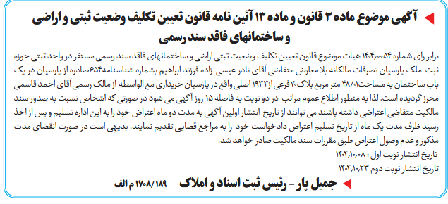برابر رای شماره ۱404٫۰۰۵4 هیات موضوع قانون تعیین تکلیف وضعیت ثبتی اراضی و ساختمانهای فاقد سند رسمی مستقر در واحد ثبتی حوزه ثبت ملک پارسیان تصرفات مالکانه بلا معارض متقاضی آقای نادر عیسی زاده فرزند ابراهیم بشماره شناسنامه654صادره از پارسیان در یک باب ساختمان به مساحت01/48 متر مربع پلاک70فرعی از1933 اصلی واقع در پارسیان خریداری مع الواسطه از مالک رسمی آقای احمد قاسمی محرز گردیده است. لذا به منظور اطلاع عموم مراتب در دو نوبت به فاصله ۱۵ روز آگهی می شود در صورتی که اشخاص نسبت به صدور سند مالکیت متقاضی اعتراضی داشته باشند می توانند از تاریخ انتشار اولین آگهی به مدت دو ماه اعتراض خود را به این اداره تسلیم و پس از اخذ رسید ظرف مدت یک ماه از تاریخ تسلیم اعتراض دادخواست خود را به مراجع قضایی تقدیم نمایند. بدیهی است در صورت انقضای مدت مذکور و عدم وصول اعتراض طبق مقررات سند مالکیت صادر خواهد شد.