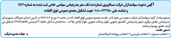 بدینوسیله از کلیه سهامداران شرکت دعوت می شود تا در جلسه مجمع عمومی فوق العاده که در ساعت 9 مورخ 6/11/1404 در آدرس استان هرمزگان ،شهرستان بندرعباس ،بخش مرکزی ،شهر بندرعباس ،گلشهر جنوبی ،بلوار رسالت جنوبی ،بلوار آزادی ،پلاک0 ، ساختمان ساحل ،طبقه 3 کدپستی 7916815354 تشکیل می گردد حضور بهمراه رسانند.