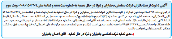 در اجرای ماده 215 اصلاحیه قانون تجارت از کلیه بستانکاران شرکت تضامنی بختیاران و شرکا در حال تصفیه به شماره ثبت 888 و شناسه ملی 10861504309 که آگهی انحلال آن در صفحه 109 روزنامه رسمی کشور به شماره 22535 مورخ 10/05/1401درج گردیده است دعوت به عمل میآید تا ظرف مدت حداکثر یکسال از تاریخ انتشار آگهی نوبت اول با ارائه مدارک مثبته ادعای خود به مدیر تصفیه آقای احسان بختیاران به شماره همراه 09031610916 مستقر در آدرس قشم مجتمع پردیس طبقه همکف واحد 6 کدپستی 7951633379 مراجعه نمایند. بدیهی است شرکت و مدیر تصفیه در مورد هرگونه ادعای احتمالی که خارج از مدت فوق به شرکت منعکس گردد مسئولیتی نخواهند داشت.