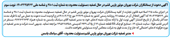 در اجرای ماده ۲۱۵ اصلاحیه قانون تجارت از کلیه پستانکاران شرکت بهروان موتور پارس قشم در حال تصفیه (مسئولیت محدود) به شماره ثبت ۳۸۰۱ و شناسه ملی ۱۴۰۰3۴۴۵۴۶۴ که آگهی انحلال آن در صفحه ۱۱۱ روزنامه رسمی کشور به شماره ۲۲۴۶۹ مورخ21/02/1401درج گردیده است دعوت به عمل می آید تا ظرف مدت حداکثر یکسال از تاریخ انتشار آگهی نوبت اول با ارائه مدارک مثبته ادعای خود به مدیر تصفیه آقای سیامک یاسمن به شماره همراه ۰۹۱۷۱۶۳۱۷۹۳ مستقر در آدرس قشم طولا -سایت شماره ۱۴- صنایع کوچک SS قطعه شماره 14 از پلاک ۱۹۳۹ کدپستی ۷۹۵۶۱۱۸۳۵۸ مراجعه نماید. بدیهی است شرکت و مدیر تصفیه در مورد هرگونه ادعای احتمالی که خارج از مدت فوق به شرکت منعکس گردد مسئولیتی نخواهند داشت.