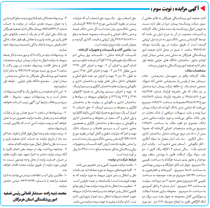 اداره تصفیه امور ورشکستگی هرمزگان شامل ملک کارخانه و تأسیسات