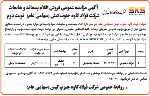 شرکت فولاد کاوه جنوب کیش (سهامی عام) در نظر دارد اقلام پسماند و ضایعات خود را (مطابق موارد مندرج در اسناد) مطابق جدول ذیل از طریق مزایده عمومی بفروش برساند .کلیه اشخاص حقیقی و حقوقی می توانند جهت خرید اسناد مزایده و بازدید از موضوع مزایده و اطلاع از شرایط مزایده از تاریخ درج آگهی تا قبل از پایان وقت اداری روز چهارشنبه مورخ 08/11/1404 به وب سایت شرکت فولاد کاوه جنوب کیش به نشانی WWW.SKSCO.IR (قسمت مزایده های جاری) مراجعه نمایند.