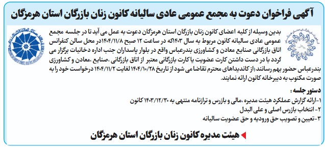 آگهی فراخوان دعوت به مجمع عمومی عادی سالیانه کانون زنان بازرگان استان هرمزگان