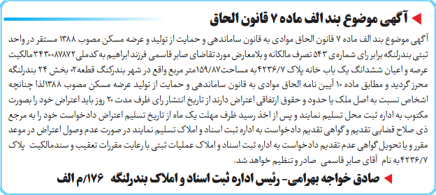 آگهی موضوع بند الف ماده ۷ قانون الحاق موادی به قانون ساماندهی و حمایت از تولید و عرضه مسکن مصوب ۱۳۸۸ مستقر در واحد ثبتی بندرلنگه برابر رای شمارهی 543 تصرف مالکانه و بلامعارض مورد تقاضای صابر قاسمی فرزند ابراهیم به کدملی3430087872مالکیت عرصه و اعیان ششدانگ یک باب خانه پلاک 7/4236به مساحت87/159متر مربع واقع در شهر بندرکنگ قطعه02 بخش ۲۴ بندرلنگه محرز گردید و مطابق ماده ۱۰ آیین نامه الحاق موادی به قانون ساماندهی و حمایت از تولید عرضه مسکن مصوب ۱۳۸۸لذا چنانچه اشخاص نسبت به اصل ملک یا حدود و حقوق ارتفاقی اعتراض دارند از تاریخ انتشار رای ظرف مدت ۲۰ روز باید اعتراض خود را بصورت مکتوب به اداره ثبت محل تسلیم نمایند و پس از اخذ رسید ظرف مهلت یک ماه از تاریخ تسلیم اعتراض دادخواست خود را به مرجع ذی صلاح قضایی تقدیم و گواهی تقدیم دادخواست به اداره ثبت اسناد و املاک تسلیم نمایند در صورت عدم وصول اعتراض در موعد مقرر و یا تحویل گواهی عدم تقدیم دادخواست به اداره ثبت اسناد و املاک عملیات ثبتی با رعایت مقررات تعقیب و سندمالکیت پلاک 7/4236به نام آقای صابر قاسمی صادر و تنظیم خواهد شد.