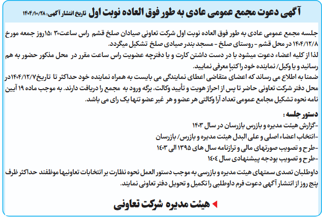 جلسه مجمع عمومی عادی به طور فوق العاده نوبت اول شرکت تعاونی صیادان صلخ قشم راس ساعت30 :15روز جمعه مورخ 8/12/1404 در محل قشم - روستای صلخ - مسجد بندر صیادی صلخ تشکیل میگردد.