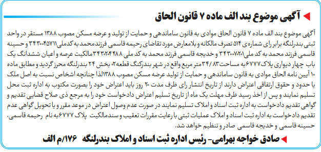 آگهی موضوع بند الف ماده ۷ قانون الحاق موادی به قانون ساماندهی و حمایت از تولید و عرضه مسکن مصوب ۱۳۸۸ مستقر در واحد ثبتی بندرلنگه برابر رای شمارهی 514 تصرف مالکانه و بلامعارض مورد تقاضای رحیمه قاسمی فرزندمحمد به کدملی3430045711 و حسینه قاسمی فرزند محمد به کد ملی3430070201 و خدیجه قاسمی فرزند محمد به کد ملی 3430204488مالکیت عرصه و اعیان ششدانگ یک باب چهار دیواری پلاک6777به مساحت83 /34متر مربع واقع در شهر بندرکنگ قطعه02 بخش ۲۴ بندرلنگه محرز گردید و مطابق ماده ۱۰ آیین نامه الحاق موادی به قانون ساماندهی و حمایت از تولید عرضه مسکن مصوب ۱۳۸۸لذا چنانچه اشخاص نسبت به اصل ملک یا حدود و حقوق ارتفاقی اعتراض دارند از تاریخ انتشار رای ظرف مدت ۲۰ روز باید اعتراض خود را بصورت مکتوب به اداره ثبت محل تسلیم نمایند و پس از اخذ رسید ظرف مهلت یک ماه از تاریخ تسلیم اعتراض دادخواست خود را به مرجع ذی صلاح قضایی تقدیم و گواهی تقدیم دادخواست به اداره ثبت اسناد و املاک تسلیم نمایند در صورت عدم وصول اعتراض در موعد مقرر و یا تحویل گواهی عدم تقدیم دادخواست به اداره ثبت اسناد و املاک عملیات ثبتی با رعایت مقررات تعقیب و سندمالکیت پلاک 6777به نام رحیمه قاسمی، حسینه قاسمی و خدیجه قاسمی صادر و تنظیم خواهد شد.