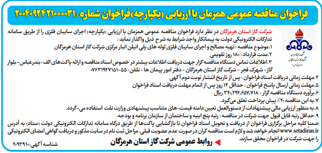 3.اطلاعات تماس دستگاه مناقصه گزار جهت دریافت اطلاعات بیشتر در خصوص اسناد مناقصه و ارائه پاکتهای الف : بندرعباس- بلوار گاز- شهرک فجر - شرکت گاز استان هرمزگان - دفتر امور پیمان ها - تلفن : 55-07631947151
