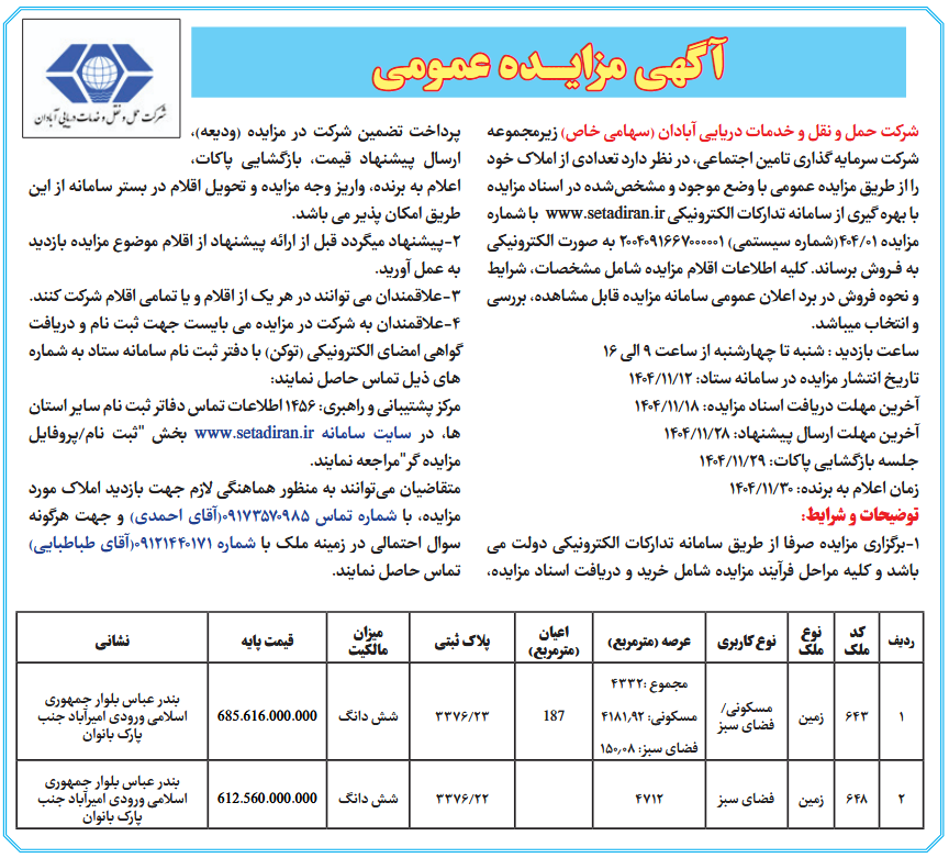 شرکت حمل و نقل و خدمات دریایی آبادان (سهامی خاص) زیرمجموعه شرکت سرمایه گذاری تامین اجتماعی، در نظر دارد تعدادی از املاک خود را از طریق مزایده عمومی با وضع موجود و مشخصشده در اسناد مزایده با بهره گیری از سامانه تدارکات الکترونیکی www.setadiran.ir با شماره مزایده 01/404(شماره سیستمی) 2004091667000001 به صورت الکترونیکی به فــروش برساند. کلیه اطلاعات اقلام مزایده شامل مشخصات، شرایط و نحوه فروش در برد اعلان عمومی سامانه مزایده قابل مشاهده، بررسی و انتخاب میباشد.