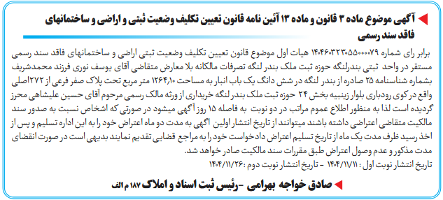 برابر رای شماره ۱4۰4۶۰32۳۰۵۵۰۰۰۰۷۹ هیات اول موضوع قانون تعیین تکلیف وضعیت ثبتی اراضی و ساختمانهای فاقد سند رسمی مستقر در واحد ثبتی بندرلنگه حوزه ثبت ملک بندر لنگه تصرفات مالکانه بلا معارض متقاضی آقای یوسف نوری فرزند محمدشریف بشماره شناسنامه ۲۵ صادره از بندر لنگه در شش دانگ یک باب انبار به مساحت ۱۲۶4٫۱۰ متر مربع تحت پلاک صفر فرعی از 272اصلی واقع در کوی رودباری بلوار زینبیه بخش ۲4 حوزه ثبت ملک بندر لنگه خریداری از ورثه مالک رسمی مرحوم آقای حسین علیشاهی محرز گردیده است لذا به منظور اطلاع عموم مراتب در دو نوبت به فاصله ۱۵ روز آگهی میشود در صورتی که اشخاص نسبت به صدور سند مالکیت متقاضی اعتراضی داشته باشند میتوانند از تاریخ انتشار اولین اگهی به مدت دو ماه اعتراض خود را به این اداره تسلیم و پس از اخذ رسید ظرف مدت یک ماه از تاریخ تسلیم اعتراض دادخواست خود را به مراجع قضایی تقدیم نمایند بدیهی است در صورت انقضای مدت مذکور و عدم وصول اعتراض طبق مقررات سند مالکیت صادر خواهد شد.
