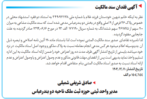نظر به اینکه خانم شهین خودستان فرزند غلام با شماره ملی ۳۴۴۰۹۲۲۱۳۸ به استناد دو فقره استشهاد محلی در خصوص پلاک ۴۶ فرعی از ۹ اصلی واقع در بخش دو بندرعباس مدعی شده است که سند مالکیت مشاعی به میزان ۲۰۰ سهم از ۴۶۷۸۹۵ سهم ششدانگ به شماره سریال ۱۷۷۱۹۰ الف ۹۳ در مورخ ۱۳۹۴٫۰۶٫۱۶ صادر گردیده به علت جابجایی مفقود گردیده .