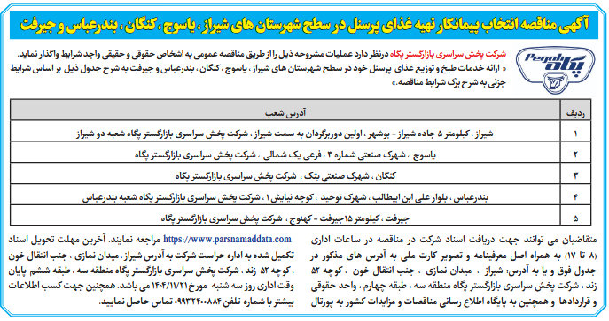 (8 تا 17) به همراه اصل معرفینامه و تصویر کارت ملی به آدرس های مذکور در جدول فوق و یا به آدرس: شیراز ، میدان نمازی ، جنب انتقال خون ، کوچه 52 زند ، شرکت پخش سراسری بازارگستر پگاه منطقه سه ، طبقه چهارم ، واحد حقوقی و قراردادها و همچنین به پایگاه اطلاع رسانی مناقصات و مزایدات کشور به پورتال https://www.parsnamaddata.com مراجعه نمایند. آخرین مهلت تحویل اسناد تکمیل شده به اداره حراست شرکت به آدرس شیراز ، میدان نمازی ، جنب انتقال خون ، کوچه 52 زند ، شرکت پخش سراسری بازارگستر پگاه منطقه سه ، طبقه ششم پایان وقت اداری روز سه شنبه مورخ 21/11/1404 می باشد. همچنین جهت کسب اطلاعات بیشتر با شماره تلفن 09932400884 تماس حاصل نمایید.
