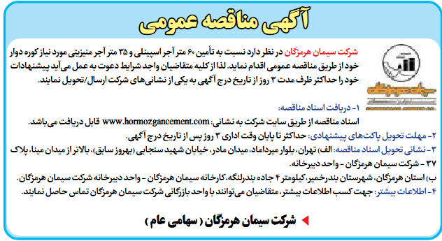 شرکت سیمان هرمزگان در نظر دارد نسبت به تأمین ۶۰ متر آجر اسپینلی و ۳۵ متر آجر منیزیتی مورد نیاز کوره دوار خود از طریق مناقصه عمومی اقدام نماید. لذا از کلیه متقاضیان واجد شرایط دعوت به عمل میآید پیشنهادات خود را حداکثر ظرف مدت ۳ روز از تاریخ درج آگهی به یکی از نشانیهای شرکت ارسال/تحویل نمایند.