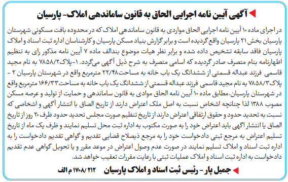 در اجرای ماده ۱۰ آیین نامه اجرایی الحاق مواردی به قانون ساماندهی املاک که در محدوده بافت مسکونی شهرستان پارسیان بخش ۲۱ پارسیان واقع گردیده است و برابر گزارش بنیاد مسکن پارسیان و کارشناسان اداره ثبت اسناد و املاک پارسیان فاقد سابقه تشخیص داده شده و برابر نظر هیات موضوع بندالف ماده ۷ آیین نامه مذکور رای به تنظیم اظهارنامه بنام متصرف صادر گردیده که اسامی متصرف به شرح ذیل آگهی میگردد. 1-پلاک2/7858 به نام مجید قاسمی فرزند عبداله قسمتی از ششدانگ یک باب خانه به مساحت48/22 مترمربع واقع در شهرستان پارسیان 2 - پلاک3/7858 به نام مجید قاسمی فرزند عبداله قسمتی از ششدانگ یک باب خانه به مساحت33/166 مترمربع واقع در شهرستان پارسیان.مطابق ماده ۱۰ آیین نامه الحاق موادی به قانون ساماندهی و حمایت از تولید و عرصه مسکن مصوب ۱۳۸۸ لذا چنانچه اشخاص نسبت به اصل ملک اعتراض دارند از تاریخ الصاق با انتشار آگهی و اشخاصی که نسبت به تحدید حدود و حقوق ارتفاقی اعتراض دارند از تاریخ تنظیم صورت مجلس تحدید حدود ظرف ۲۰ روز از تاریخ الصاق یا انتشار اگهی باید اعتراض خود را به صورت مکتوب به اداره ثبت محل تسلیم نمایند و ظرف یک ماه از تاریخ تسلیم اعتراض به مرجع ثبتی دادخواست خود را به مرجع ذیصلاح قضایی تقدیم و گواهی تقدیم دادخواست را به اداره ثبت اسناد و املاک تسلیم نمایند در صورت عدم وصول اعتراض در موعد مقرر و یا تحویل گواهی عدم تقدیم دادخواست به اداره ثبت اسناد و املاک عملیات ثبتی با رعایت مقررات تعقیب خواهد شد.