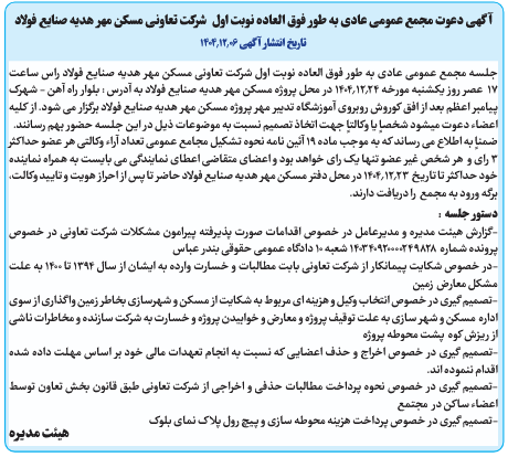 جلسه مجمع عمومی عادی به طور فوق العاده نوبت اول شرکت تعاونی مسکن مهر هدیه صنایع فولاد راس ساعت ۱۷ عصر روز یکشنبه مورخه ۱۴۰۴٫۱۲٫۲۴ در محل پروژه مسکن مهر هدیه صنایع فولاد به آدرس : بلوار راه آهن - شهرک پیامبر اعظم بعد از افق کوروش روبروی آموزشگاه تدبیر مهر پروژه مسکن مهر هدیه صنایع فولاد برگزار می شود. از کلیه اعضاء دعوت میشود شخصاً یا وکالتاً جهت اتخاذ تصمیم نسبت به موضوعات ذیل در این جلسه حضور بهم رسانند.