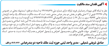 نظر به اینکه آقای مهرداد رحمانیان فرزند ایازاله دارای شماره ملی ۲۴۷۱۶۵۰۴۹۱ به استناد دو فقره استشهاد محلی در خصوص پلاک ۲۴۳۹۷ فرعی از ۳ اصلی واقع در بخش دو بندر عباس مدعی شده است که سند مالکیت ششدانگ یک واحد آپارتمان بشماره چاپی ۰۲۵۶۸۲ سری ب سال ۹۶ با شماره دفتر الکترونیکی ۱۳۹۷۲۰۳۲۳۰۵۴۰۰۲۴۴۴ ثبت گردیده است و به علت جابجایی مفقود گردیده لذا نامبرده تقاضای صدور سند مالکیت المثنی نموده است لذا باستناد ماده ۱۲۰ آئین نامه اصلاحی و تبصره ذیل آن بدینوسیله اعلام میشود هر کس مدعی انجام معامله نسبت به پلاک مذکور و وجود اصل اسناد مالکیت در نزد خود میباشد بایستی از تاریخ انتشار آگهی ظرف مدت ده روز اعتراض خود را ضمن ارائه اسناد مالکیت به این اداره تسلیم واخذ نماید بدیهی است پس از انقضای مهلت قانونی مذکور و عدم وصول اعتراض و یا وصول اعتراض و عدم ارائه اسناد نسبت به صدور اسناد مالکیت المثنى بنام متقاضی اقدام خواهد شد.