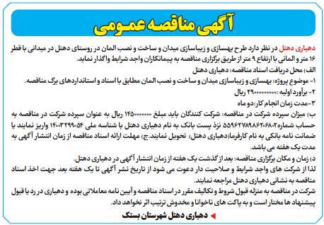 د) زمان و مکان برگزاری مناقصه: بعد از گذشت یک هفته از زمان انتشار آگهی در دهیاری دهتل.