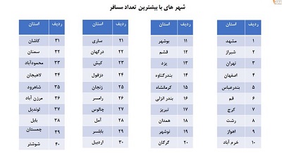 او ادامه داد: تا ۱۵ نوروز ۳۶ میلیون و ۵۱۹ هزار و ۶۷۱ نفر سفر رفتهاند و شهرهای مشهد، شیراز، تهران، اصفهان، بندرعباس، قم، کرج، رشت، اهواز، خرم آباد، بوشهر، قشم، یزد، بندرگناوه، کرمانشاه، بندر انزلی، تبریز، همدان، نوشهر، گرگان، ساری، درگهان، کیش، دزفول، زنجان، رامسر، چالوس، آمل، بابلسر، اردبیل، کاشان، سمنان، محمودآباد، لاهیجان، شاهرود، مرزن آباد، لوندیل، بابل، چمستان و شوشتر به ترتیب بیشترین تعداد مسافر را در تعطیلات نوروز داشتهاند.