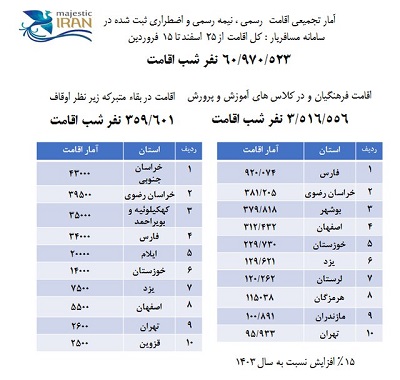 فاطمی افزود: اقامت در کلاسهای درس آموزش و پرورش و مراکز اقامتی فرهنگیان نیز سه میلیون و ۵۱۶ هزار و ۵۵۶ نفرشب بوده که نسبت به نوروز سال گذشته ۱۵ درصد رشد را تجربه کرده است. همچنین در بقاع متبرکه زیرنظر اوقاف ۳۵۹ هزار و ۶۰۱ نفر شب اقامت ثبت شده است.